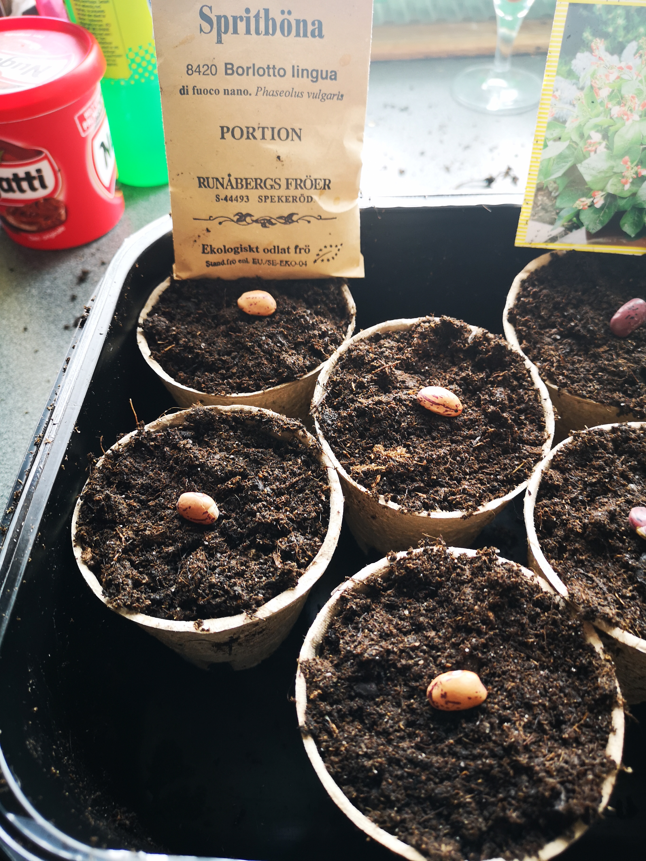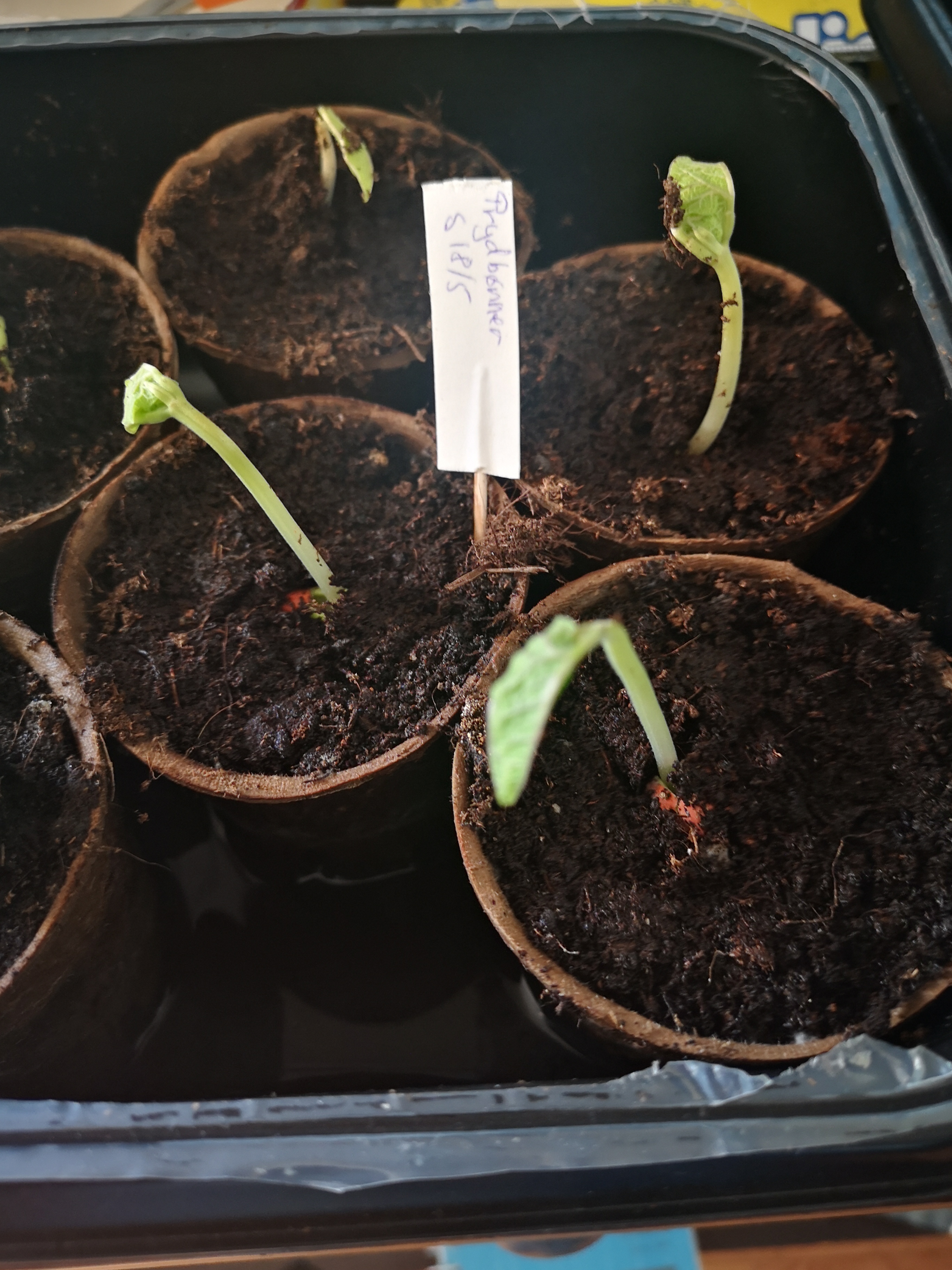Har sådd bare fire bønner av denne sorten også foreløpig, men setter nok ned flere etter hvert. Disse ble heller ikke lagt i bløt før såing, så vi må nok være tålmodige.