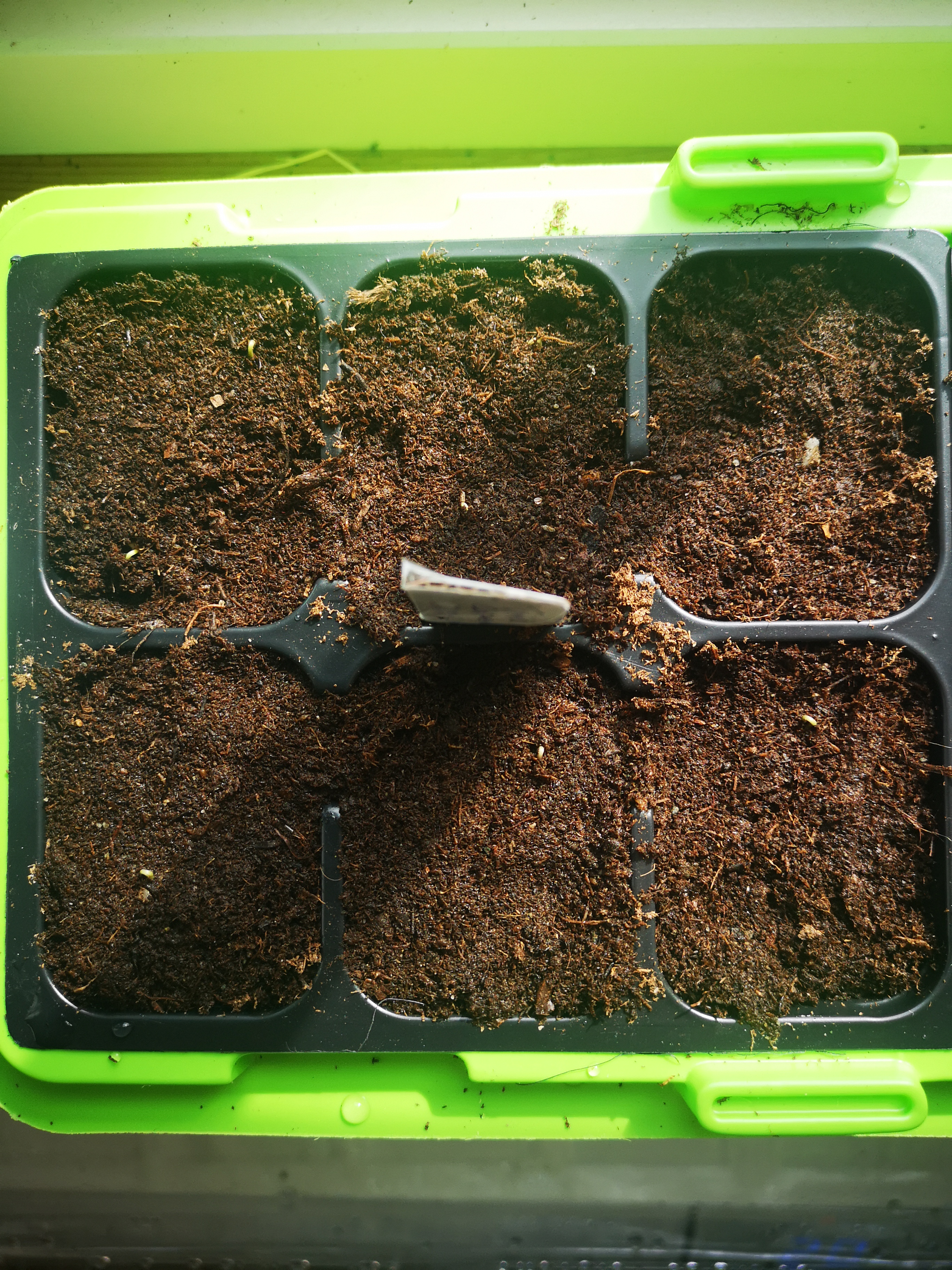 Denne chili-sorten var treg med å komme i gang denne gangen også, men vi håper på at den setter litt fart nå som solen har kommet. Disse måtte også ha et par kvelder ved vedovnen for å komme skikkelig i gang, og framdeles er det to potter hvor det ikke har kommet opp noe. Krysser fingrene for at de kommer, for som jeg har nevnt før er Trinidad Purple Coffee en av sortene jeg er mest spent på. Får prøve å passe godt på dem denne gangen.