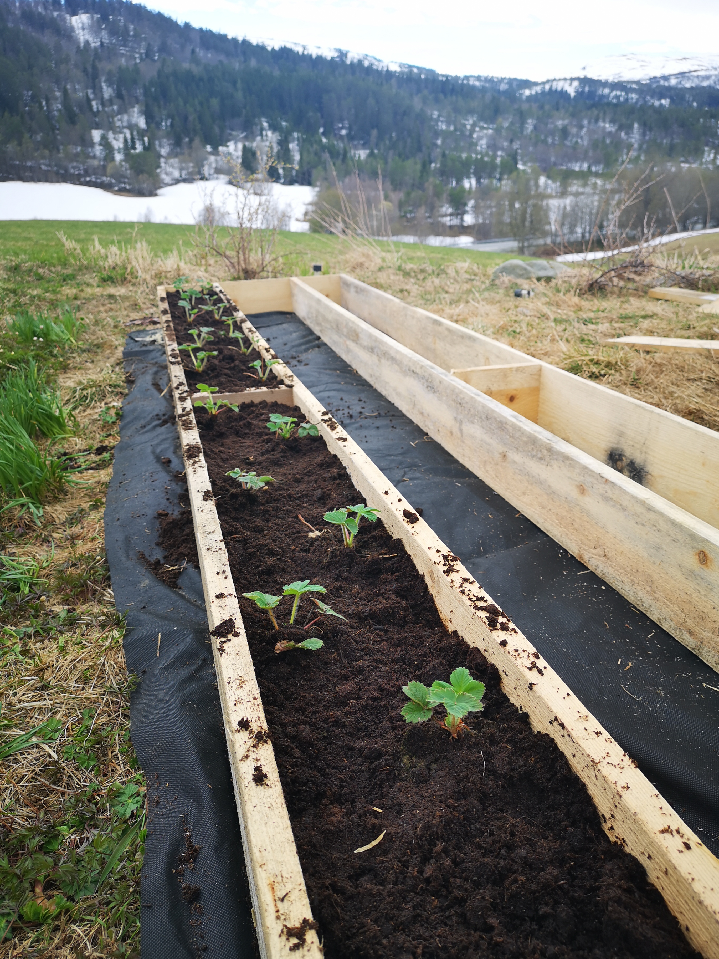 I første omgang hadde vi ikke nok jord til å fylle opp alt, så det ble bare Korona-planter foreløpig. Skal også få tak i noen flere planter, så vi fyller opp den ene siden med Korona. På den andre siden blir det da Polka og Honeye. I feltet mellom radene har vi tenkt å legge på bark, så det holder litt ekstra på fuktigheten. Samtidig hindrer det at jorda lekker ut der det ikke er helt flatt.
